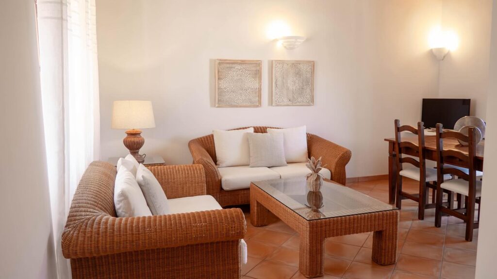 Furnished in elegant décor, all the apartments, including the superior suite with terrace (pictured above), have traditional terracotta tiled flooring, exposed ceiling beams, textiles in colours of taupe and biscuit and comfy furniture all contributing to a homely stay.