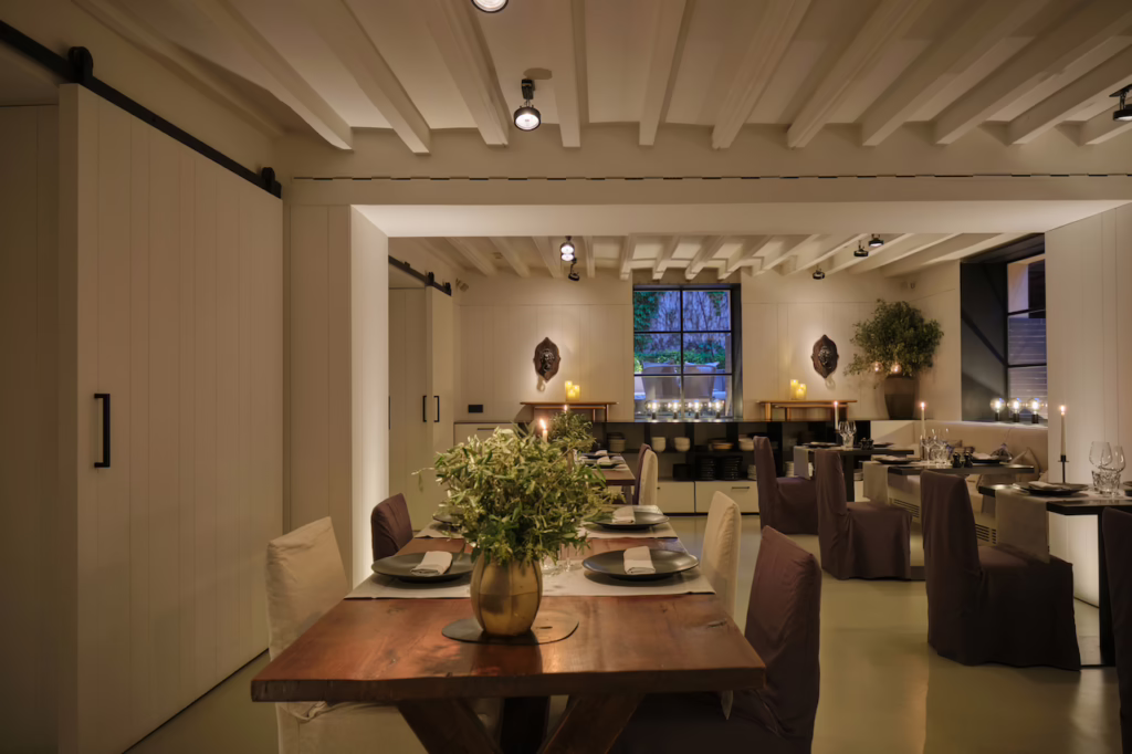 Die Einrichtung ist geschmackvoll und unaufdringlich, wobei viele Originalmerkmale des Gebäudes aus dem 19. Jahrhundert erhalten geblieben sind, darunter Fresken und gewölbte Türen, die sich nahtlos in das kühle, moderne Design einfügen.