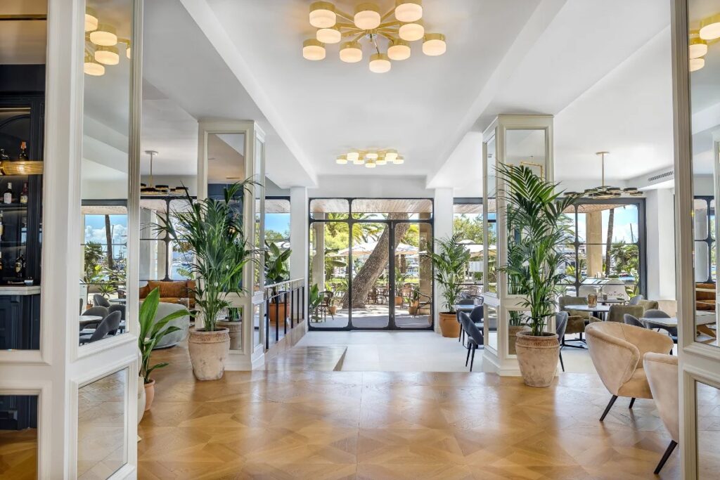 Gold mirrored panels and spectacular chandeliers offer gilded luxury to the open plan lobby and the midnight blue cocktail bar with complementing white leather bar stools add further flair to the design. But it does not feel oppressive in this sunny climate with floor to ceiling Crittall windows creating an indoor – outdoor feeling.