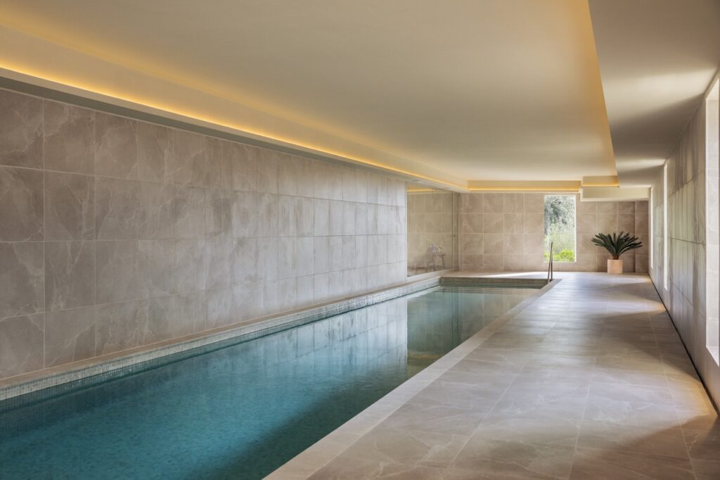 There are two pools, one outside, flanked by sunbeds and one inside in the wellness area along with sauna and Turkish bath as well as two treatment rooms.