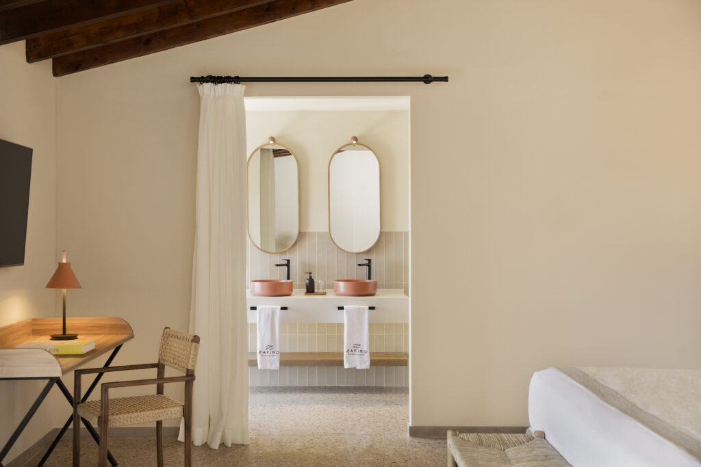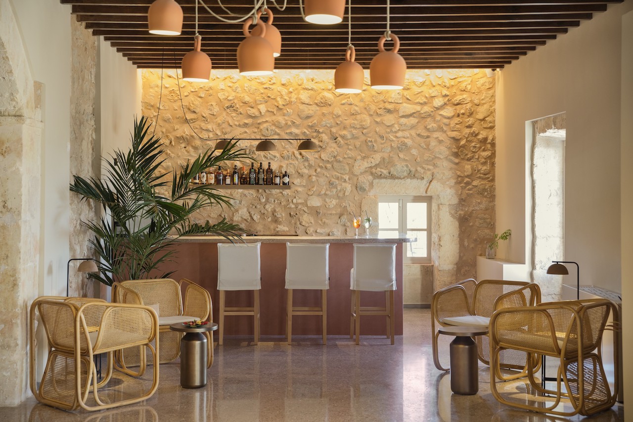 The main house is part of a collection of smaller stone dwellings, all beautifully restored into private villas and suites with interior design by Marga Rotger. Natural materials of wood and polished stone complement whitewashed walls, traditional beams and creams and taupe fabrics, creating a rustic contemporary haven of calm.