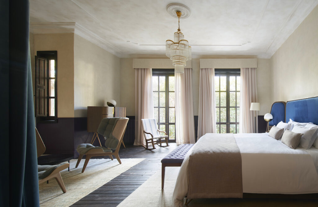 Each of the suites at Can Bordoy Grand House and Garden feels palatial with double-height ceilings, open-plan layouts separated only by theatrical velvet floor – to – ceiling curtains. Painstakingly renovated frescoes and marble fireplaces, paired with industrial-style lighting and hand made mid century furnishings like the quirky teak maxi bar stand work seamlessly together. And mod cons even include pressure control of your mattress at the touch of a button.